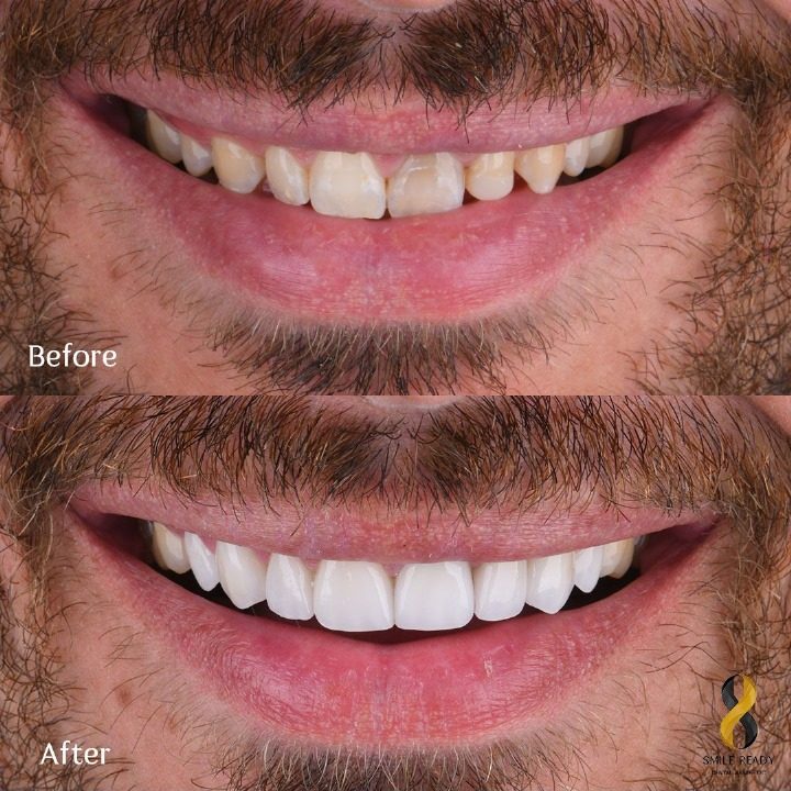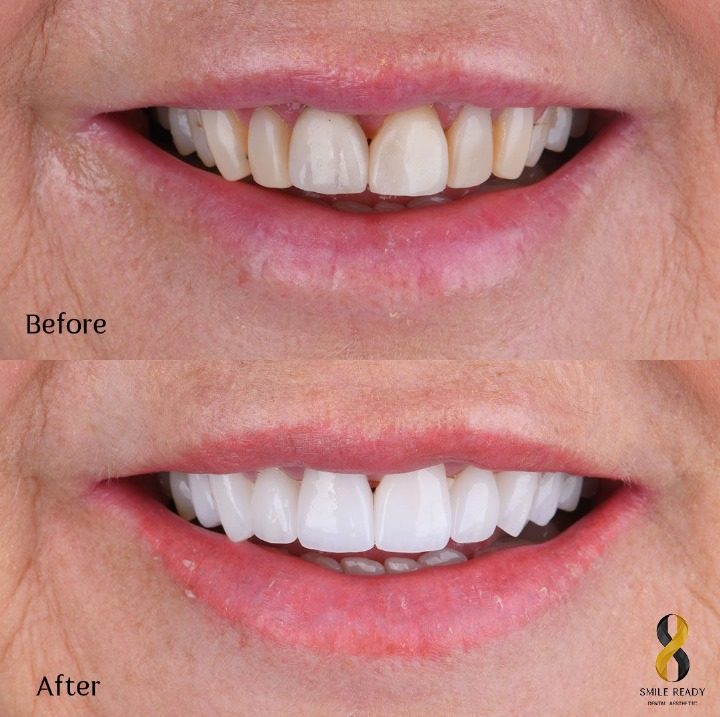 Is a layer of material placed over a tooth. Veneers can improve the aesthetics of a smile and protect the tooth’s surface from damage. Porcelain veneer fabricated by a dental technician in a dental lab, and later bonded to the tooth, typically using a resin cement.